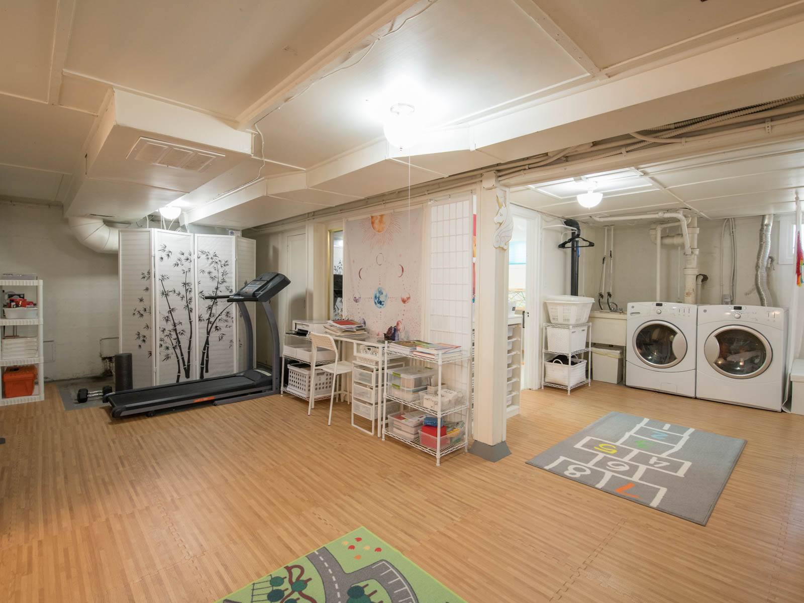 In the 874 sqft basement, there is an open plan family/bonus area (currently used and ideal for: homeschooling), a large and bright 12.8×12.10 bedroom with light-filled egress window, a second bath with box-shower, and the laundry facility/utilities. It is an ideal space for a growing household, or to be built out into a super deluxe master suite!