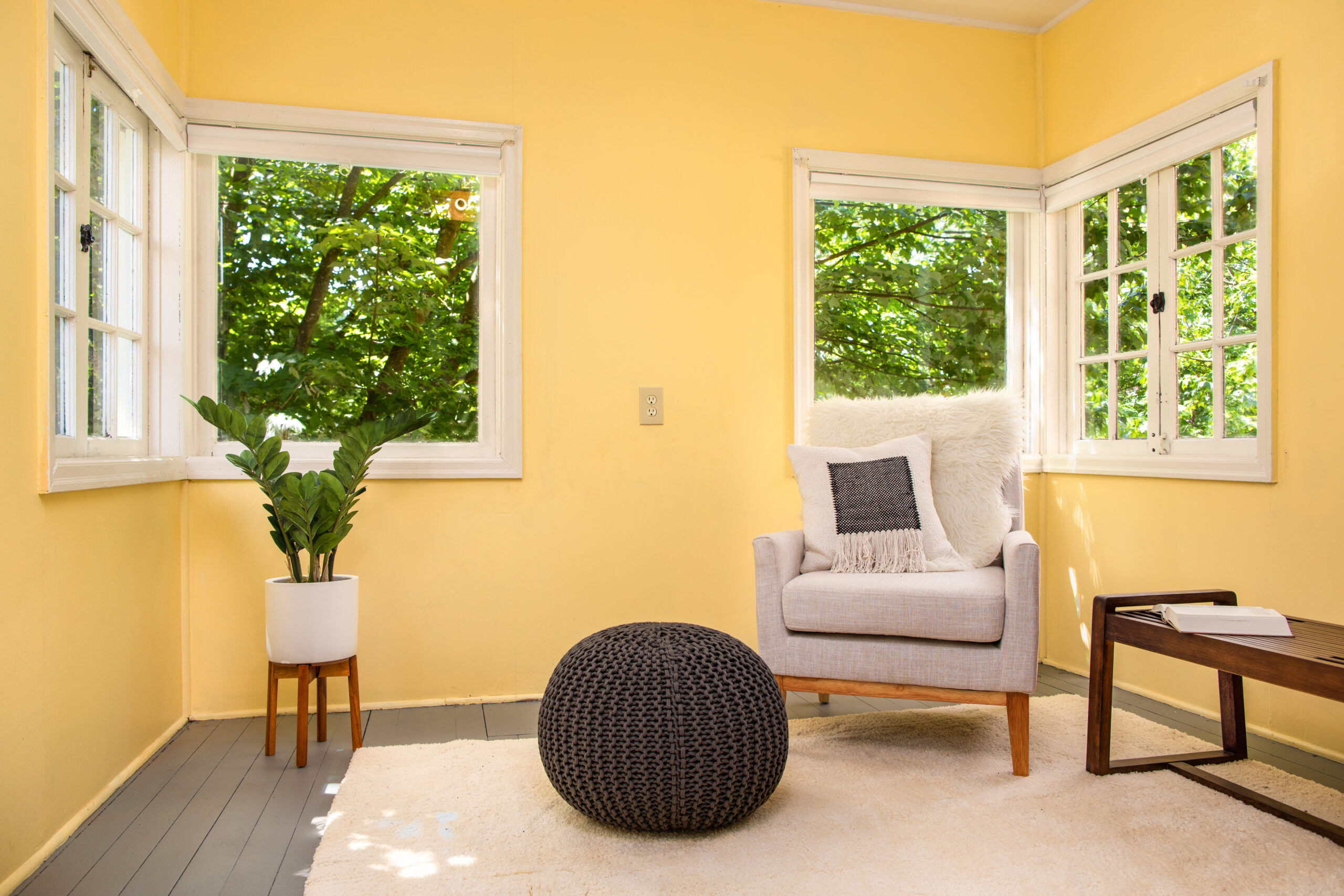 – Surrounded by windows with a door to the deck