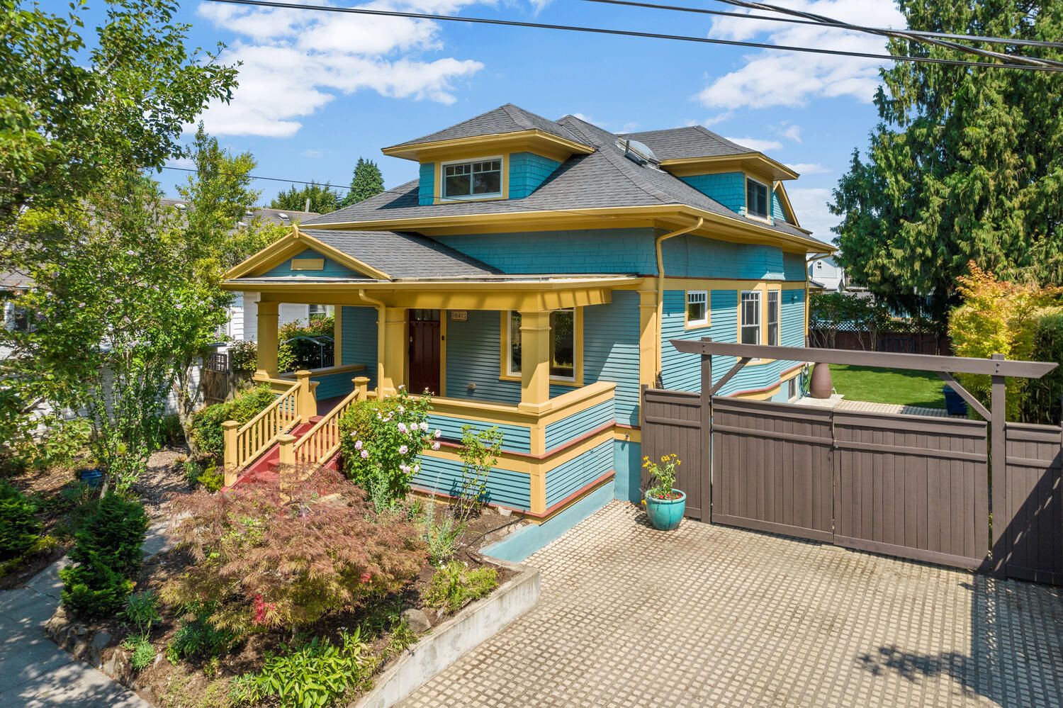 Sellwood Farmhouse. Vintage details – modern amenities. Blocks from grocery, coffee, shops, parks, bike routes. Updates to most systems, hardwoods and new carpets, tile work and charming moudlings. Kitchen with pantry, dining nook and backyard access. Gardens, entertainment spaces, established flora and bonus exterior office/studio. Three bedrooms upstairs – creates spacious main floor; formal dining room, broad living room, entry and storage.