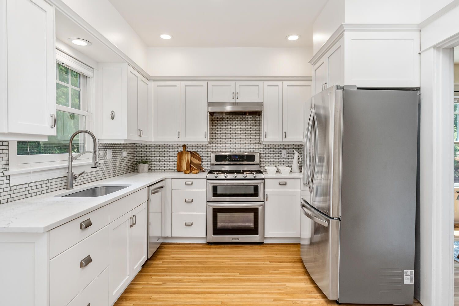 Light-filled living room with charming leaded glass accents opens to a lovely formal dining room. Chef’s kitchen with quartz counters, butler’s pantry, breakfast nook, and induction range. A bedroom/den/office and sweet updated powder room (with room to expand!) round out the main floor.