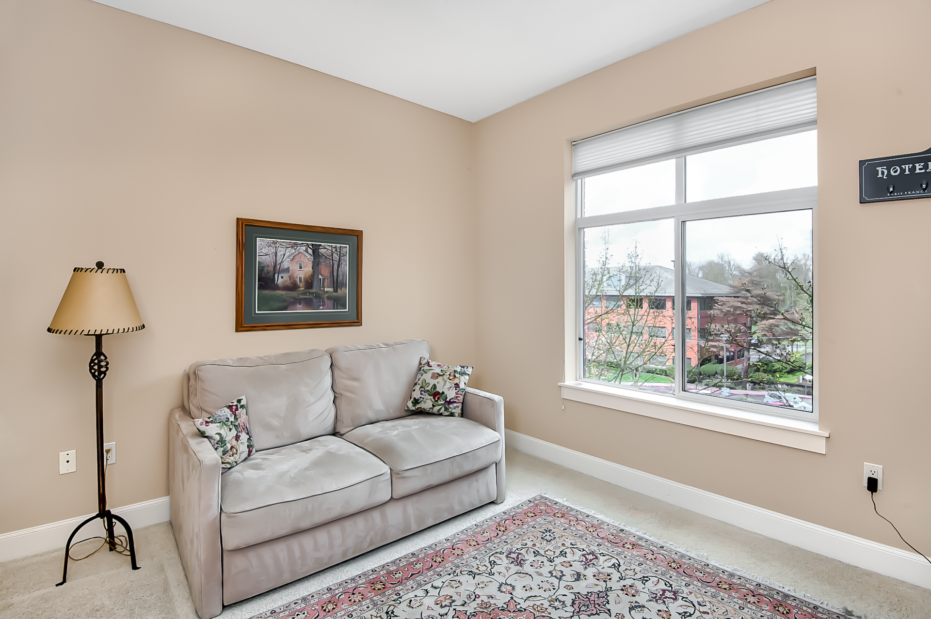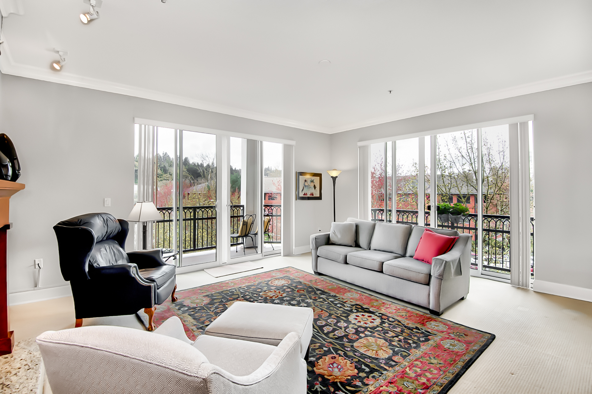 Open and bright living room with large windows + French doors to balcony