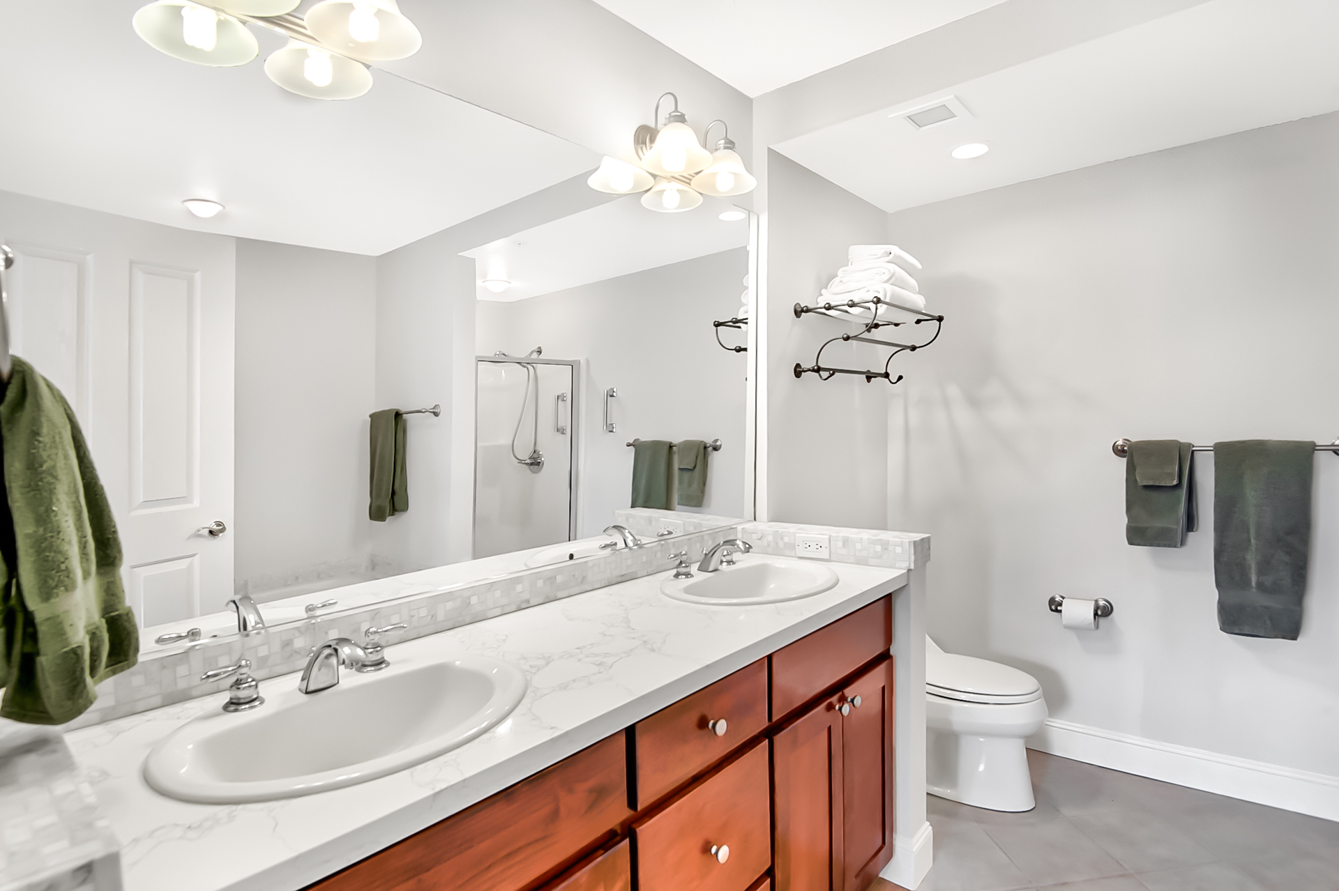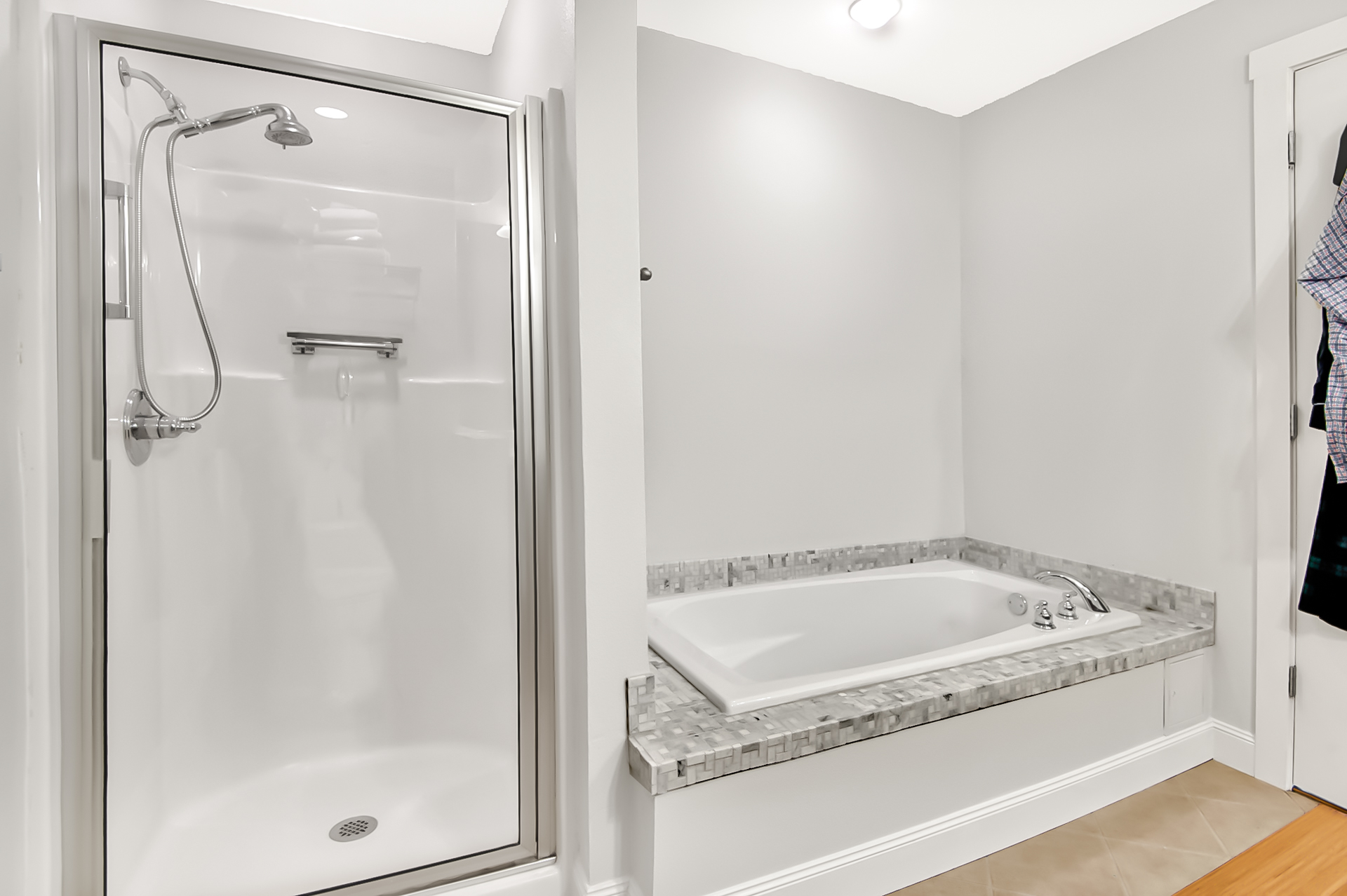 Honey toned hardwood floors, cool tile and plush wall to wall carpeting