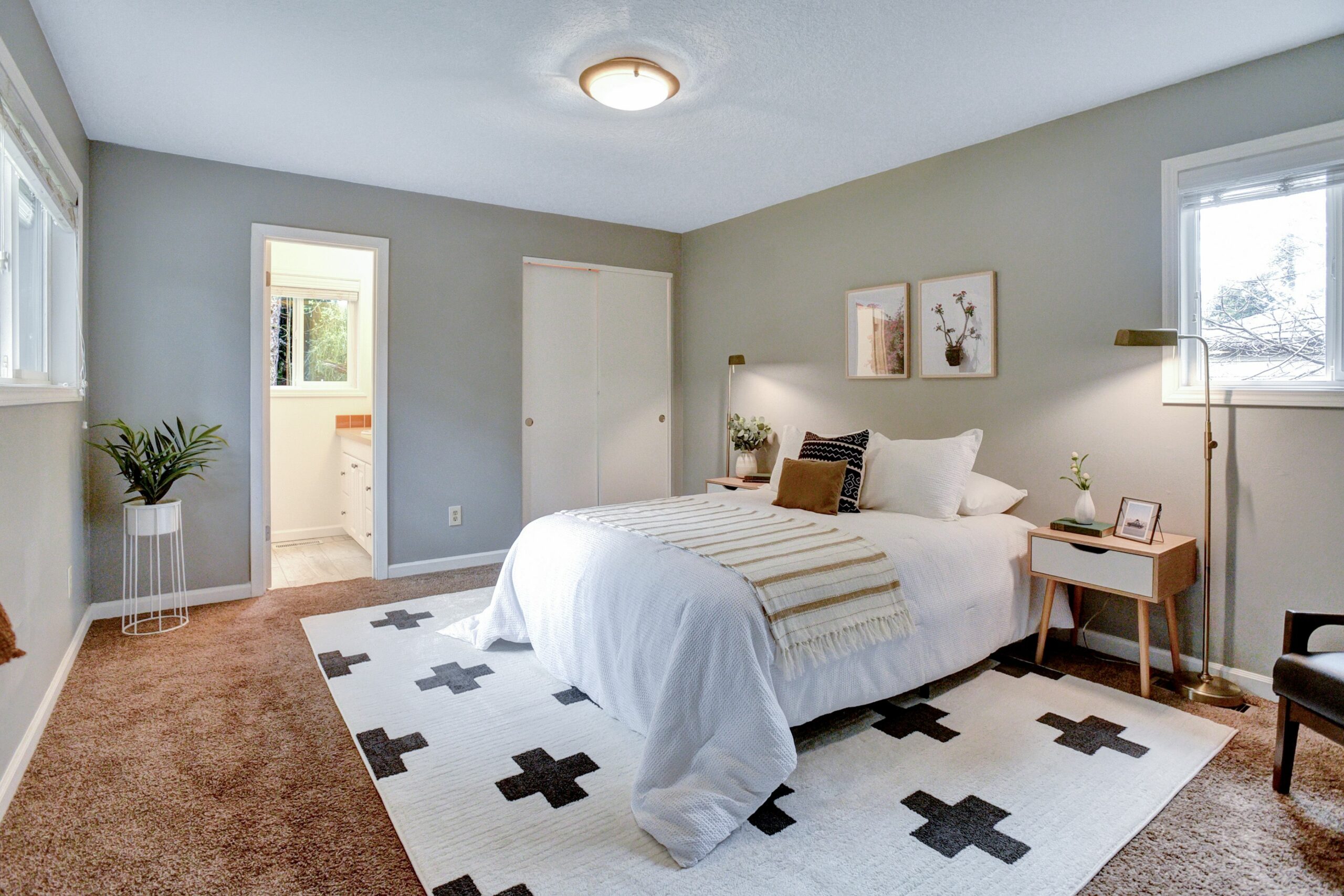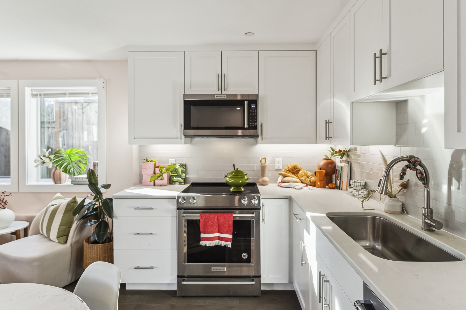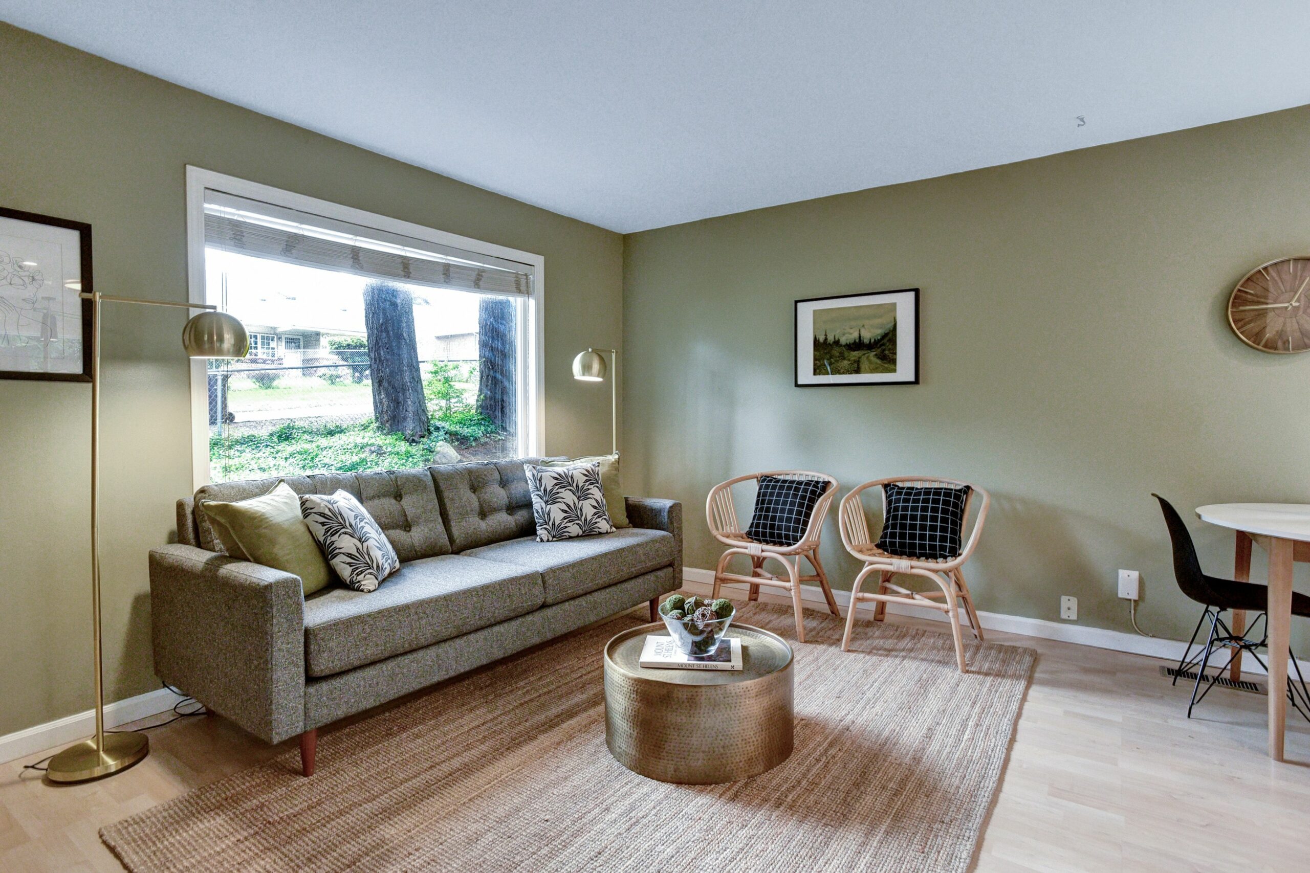 This one level Sellwood condo has it all: a spacious main living space with half bath for guests, a modern kitchen with quartz counters and stainless steel appliances, two generous bedrooms that are tucked away and quiet, a large bathroom with soaking tub, and in-unit laundry.
