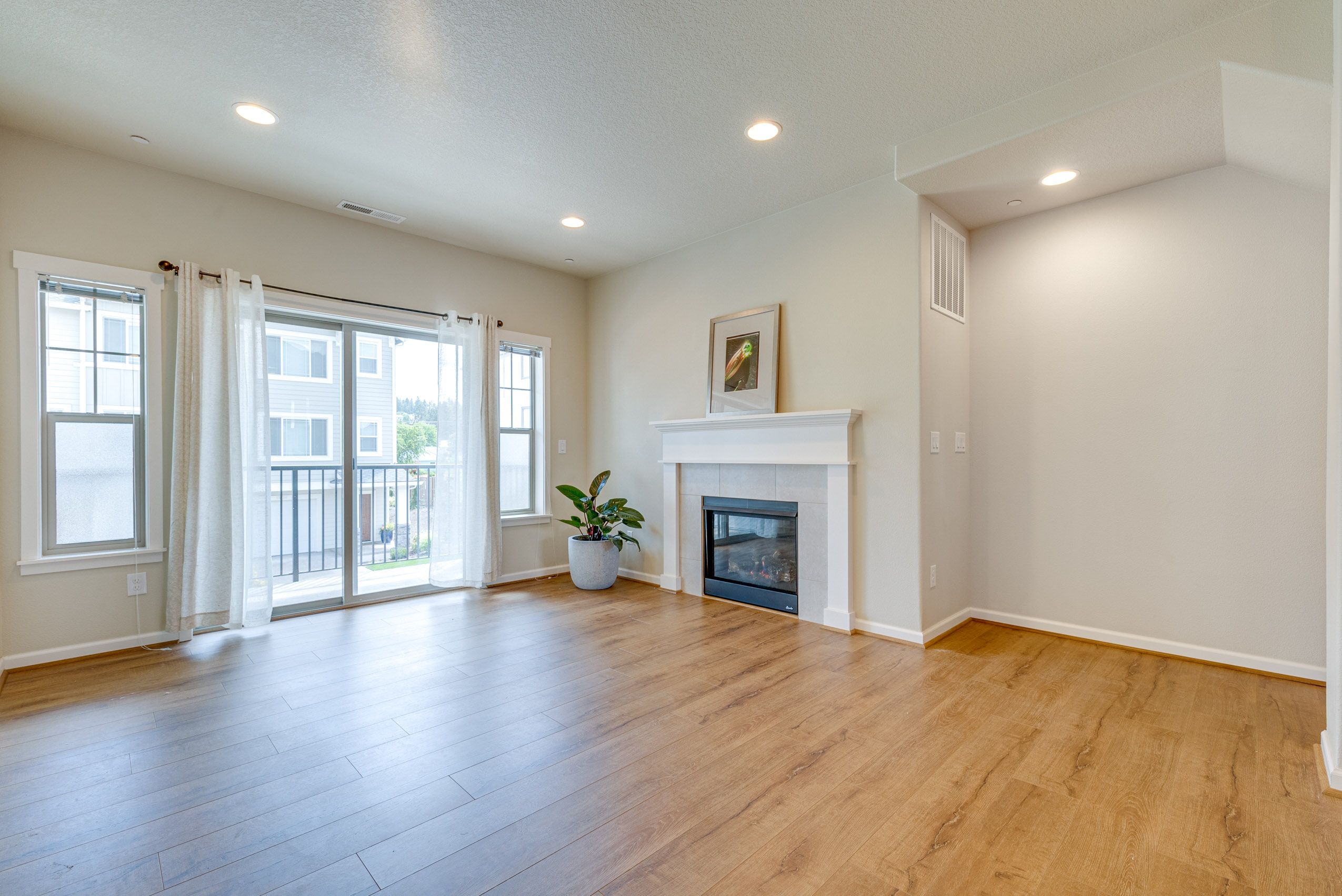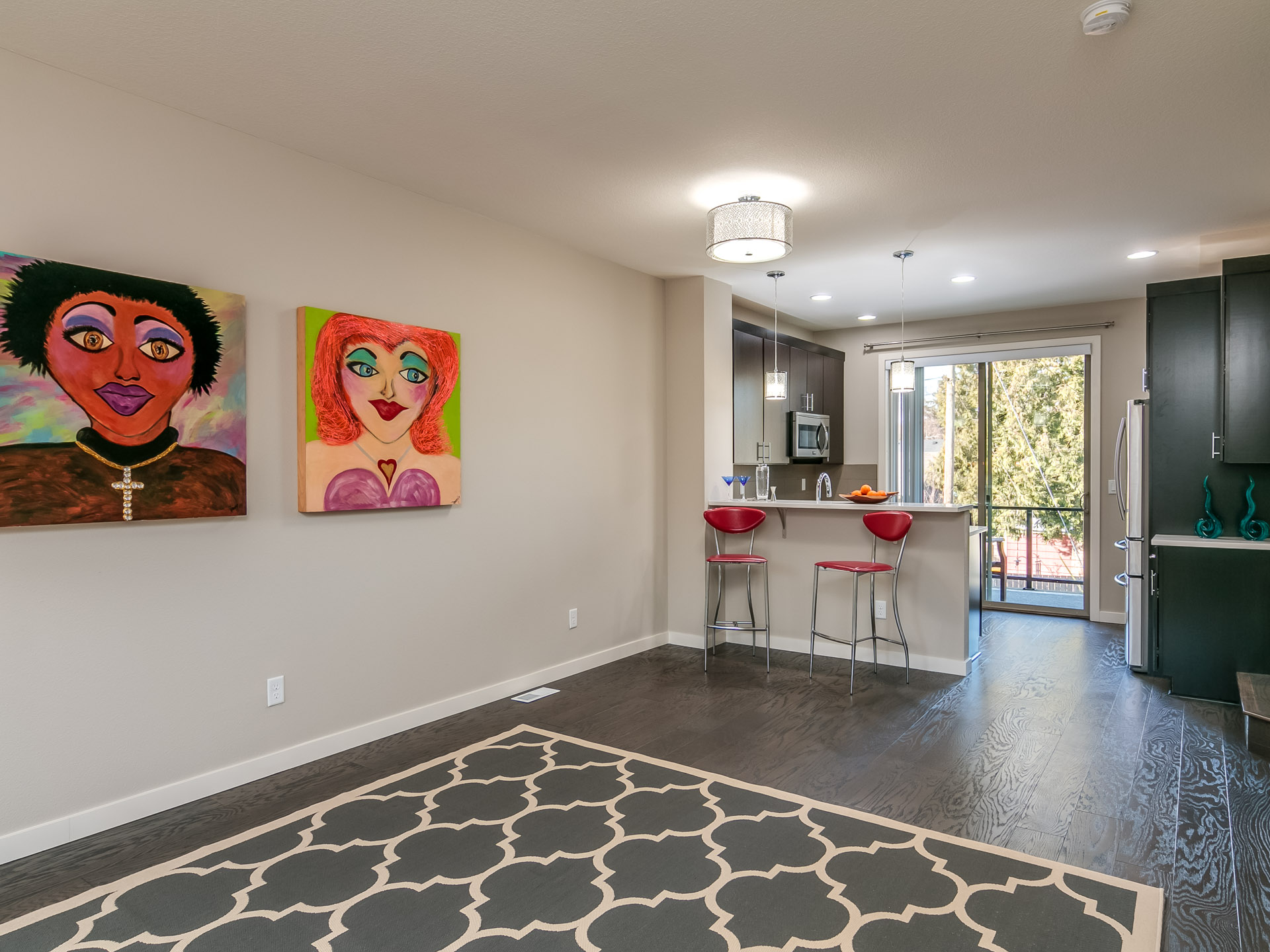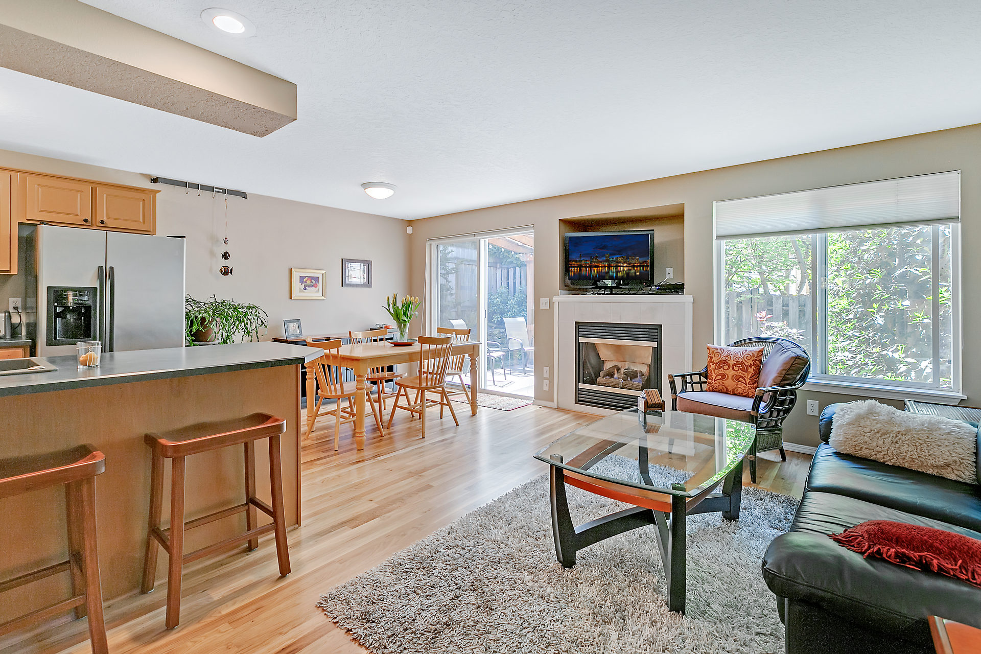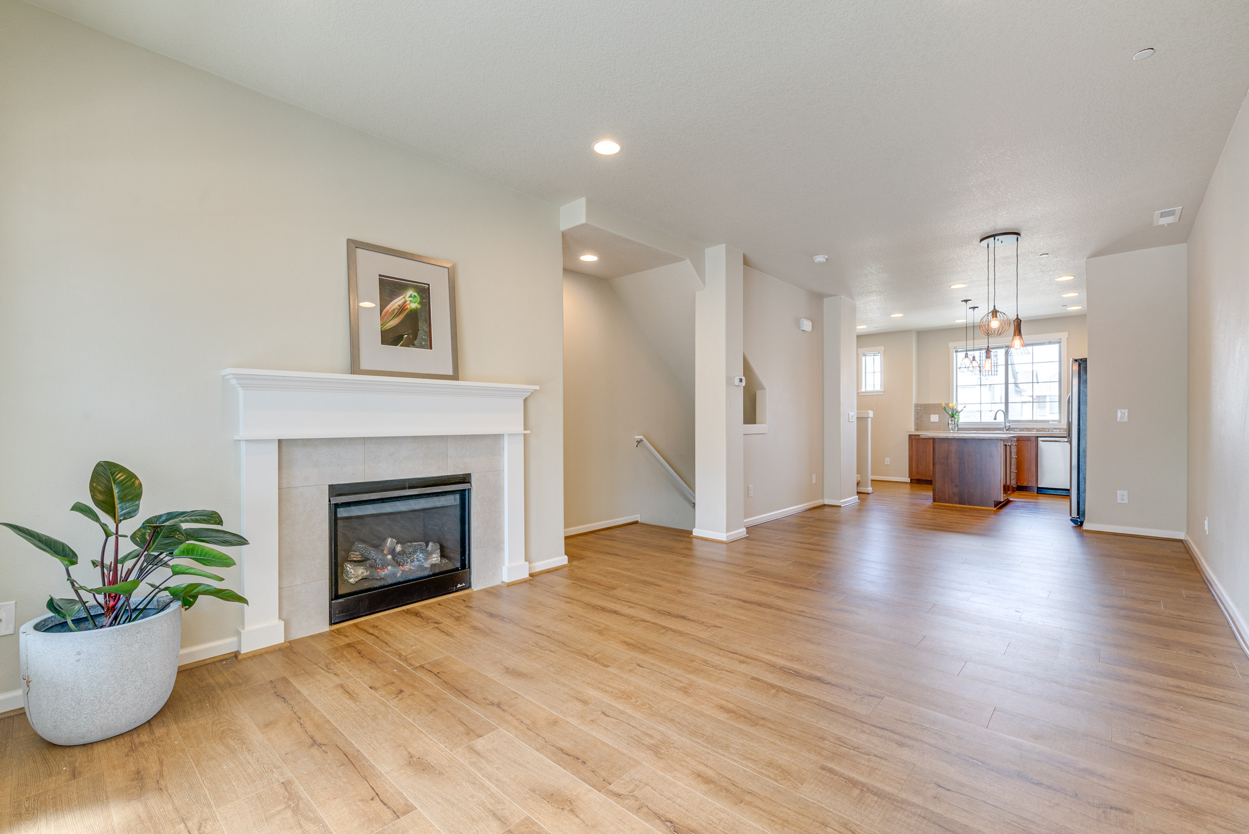 This upgraded townhome offers elegant luxury at an affordable price! Step through the front door and immediately notice the care and attention to detail, with updated engineered wood flooring, smooth-finished walls, and a beautifully tiled fireplace adjacent to your private backyard access! The yard is a rarity for this property type, and it is meticulously landscaped, wonderfully inviting, and includes a patio for al fresco dining during the summer months.