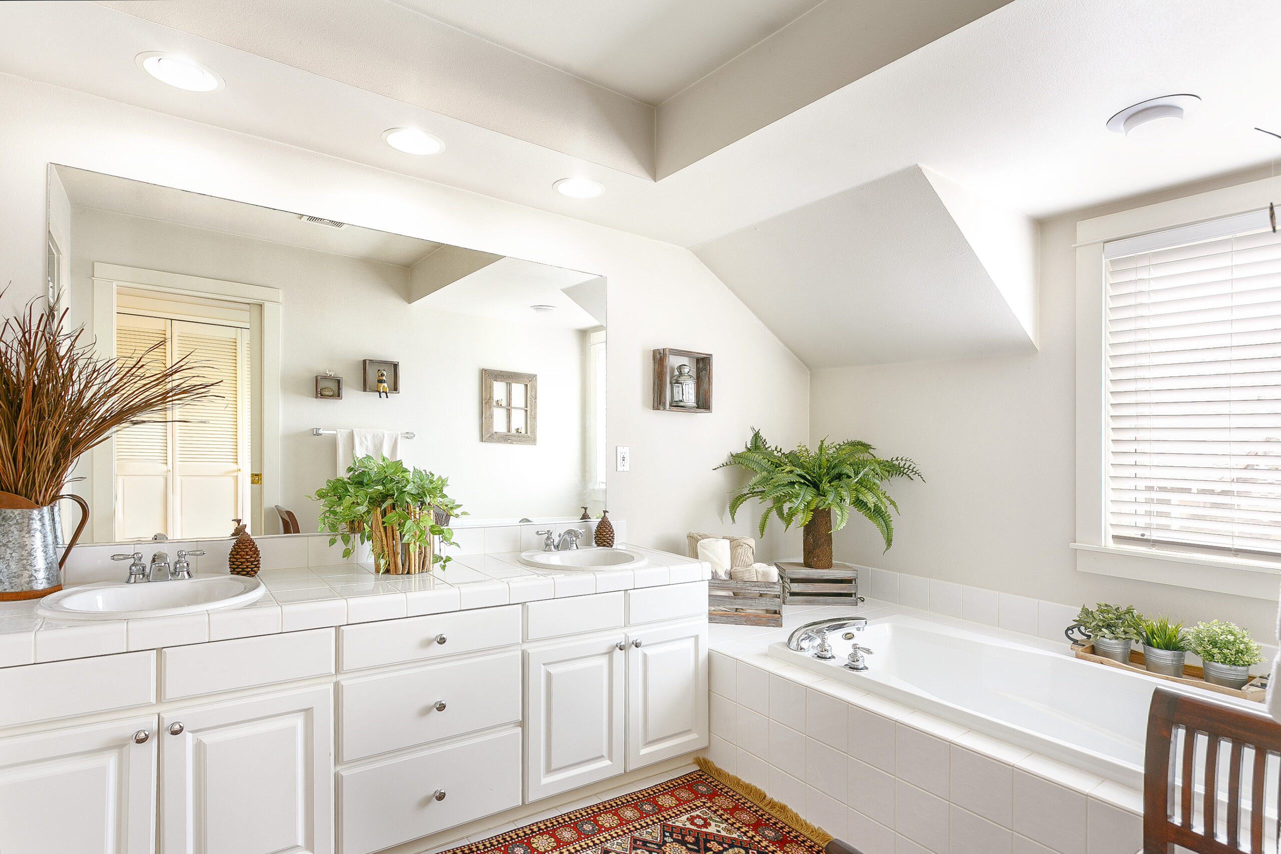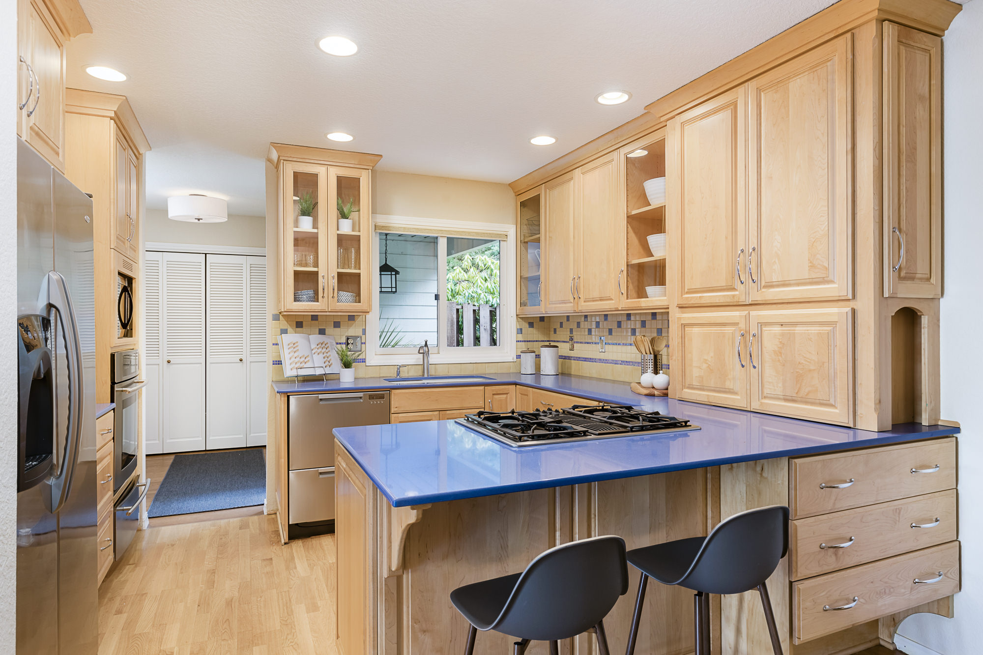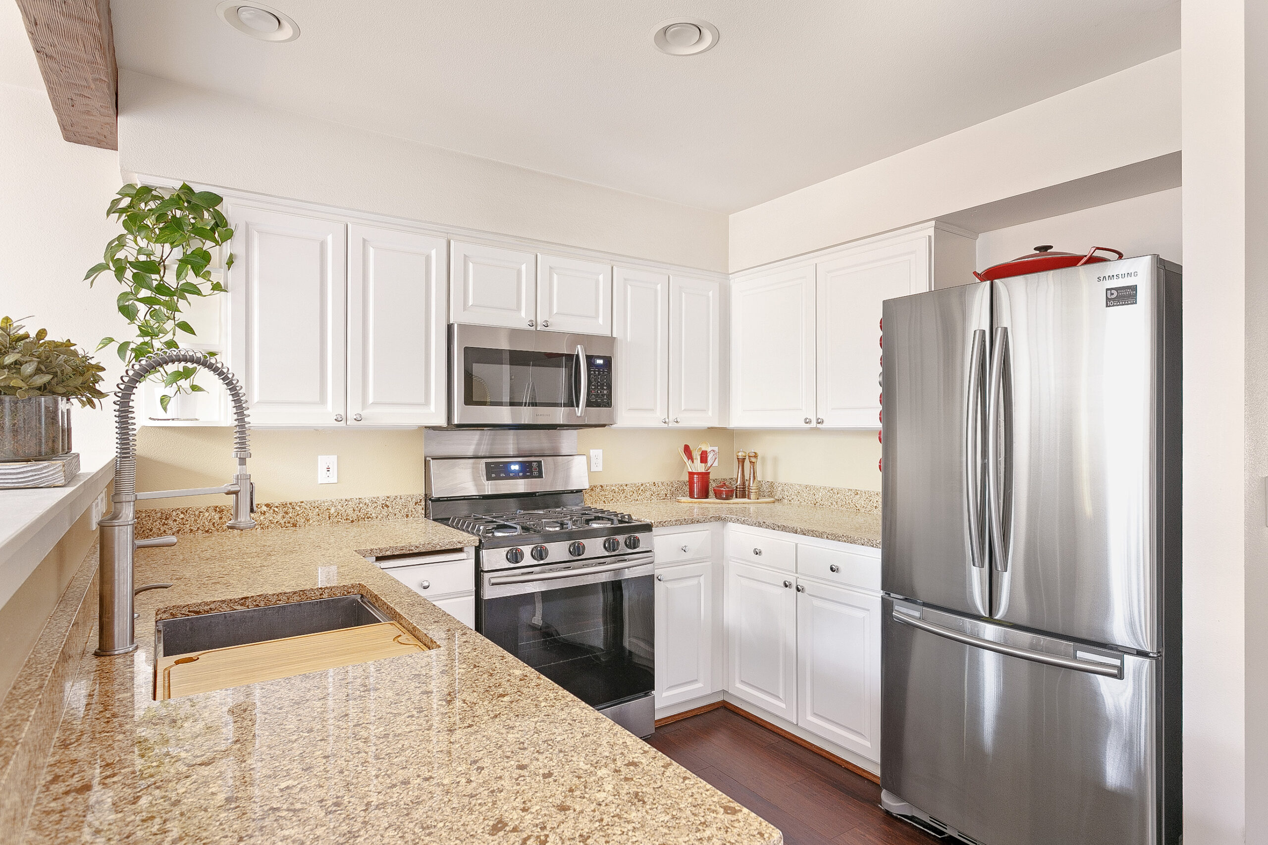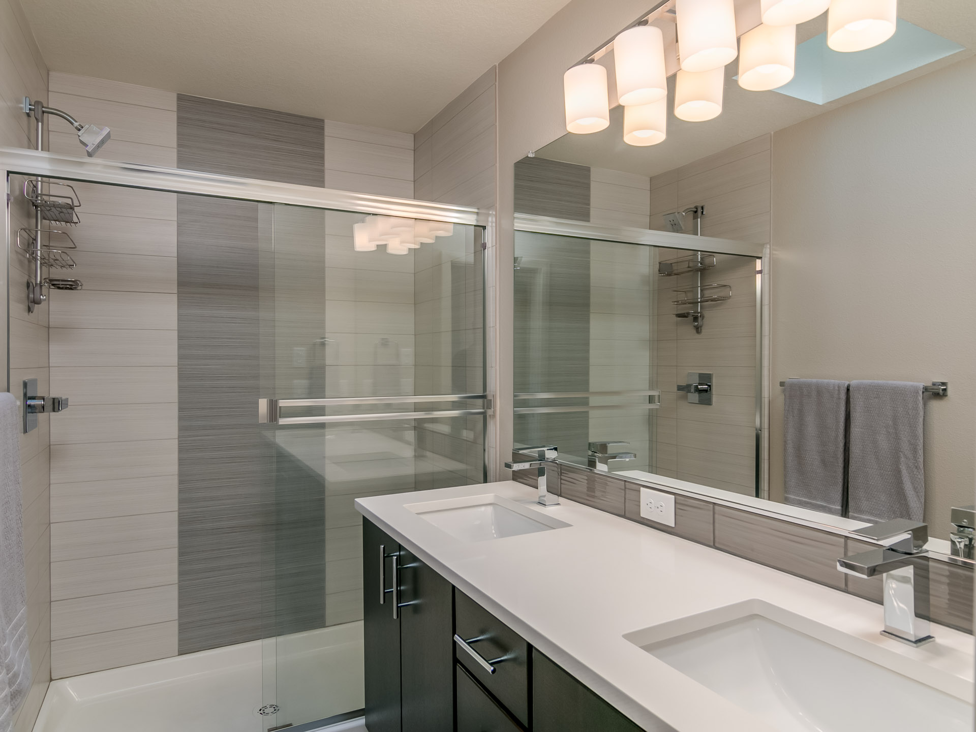 The kitchen features newer appliances, quartz countertops, and a convenient breakfast bar for entertaining while you cook. Upstairs, find two spacious bedrooms, each with a recently remodeled ensuite bath featuring sophisticated designer finishes.
