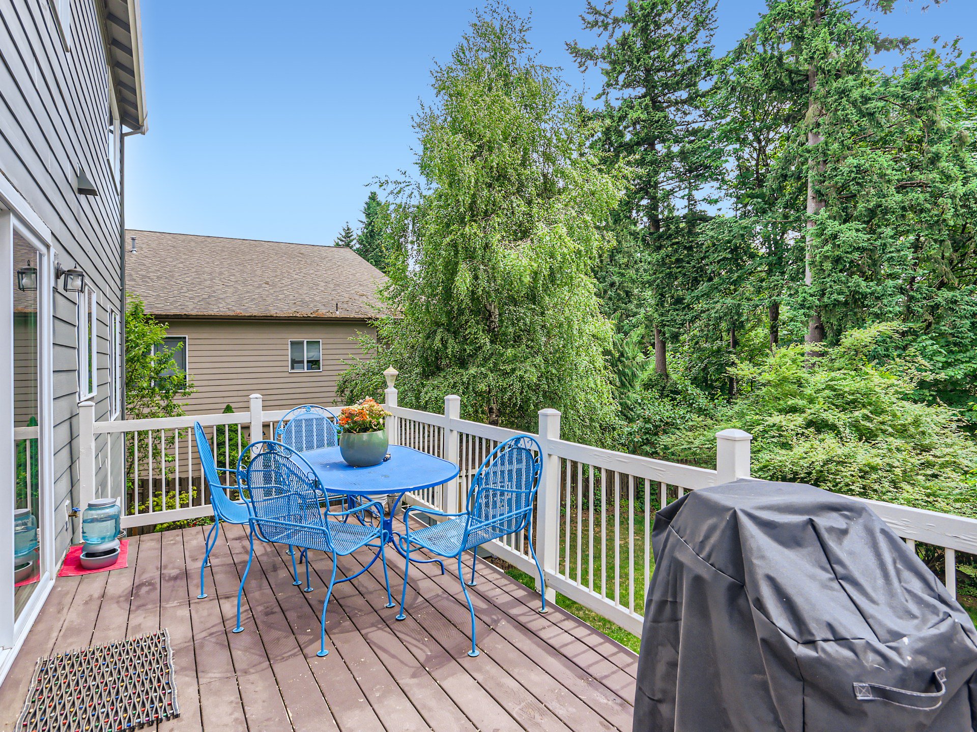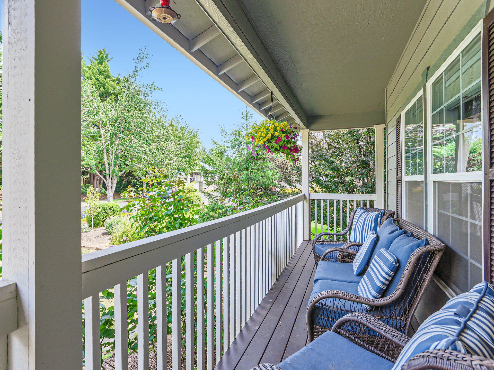 Head up the open staircase and you’ll find a balcony with more room for lounging and enjoying the outdoors. The primary bedroom is spacious, with large windows allowing for a lovely light-filled space, and be sure to check out the walk-in closet! The ensuite bathroom has a roomy and luxe walk-in shower with tile & glass doors and granite counter vanity. The other two upstairs bedrooms have great natural light coming in and good-sized closets!