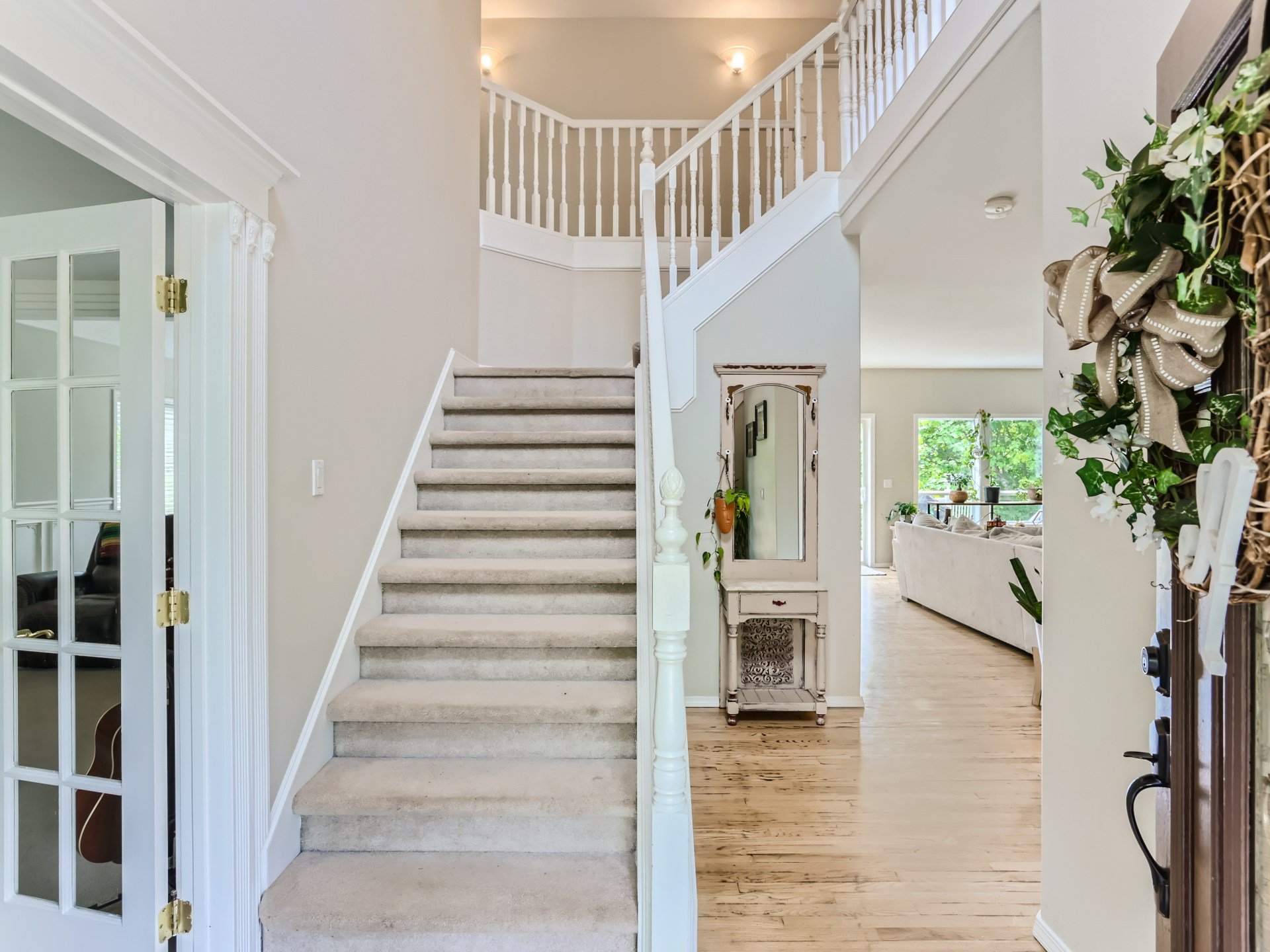 As you enter the home, you will be struck by the sizable entryway inside, where an inviting passageway leads into the living spaces. To your right through frosted double doors is a spacious and welcoming office/den area. This room is full of potential, and lovely natural light comes in from the front-facing window.