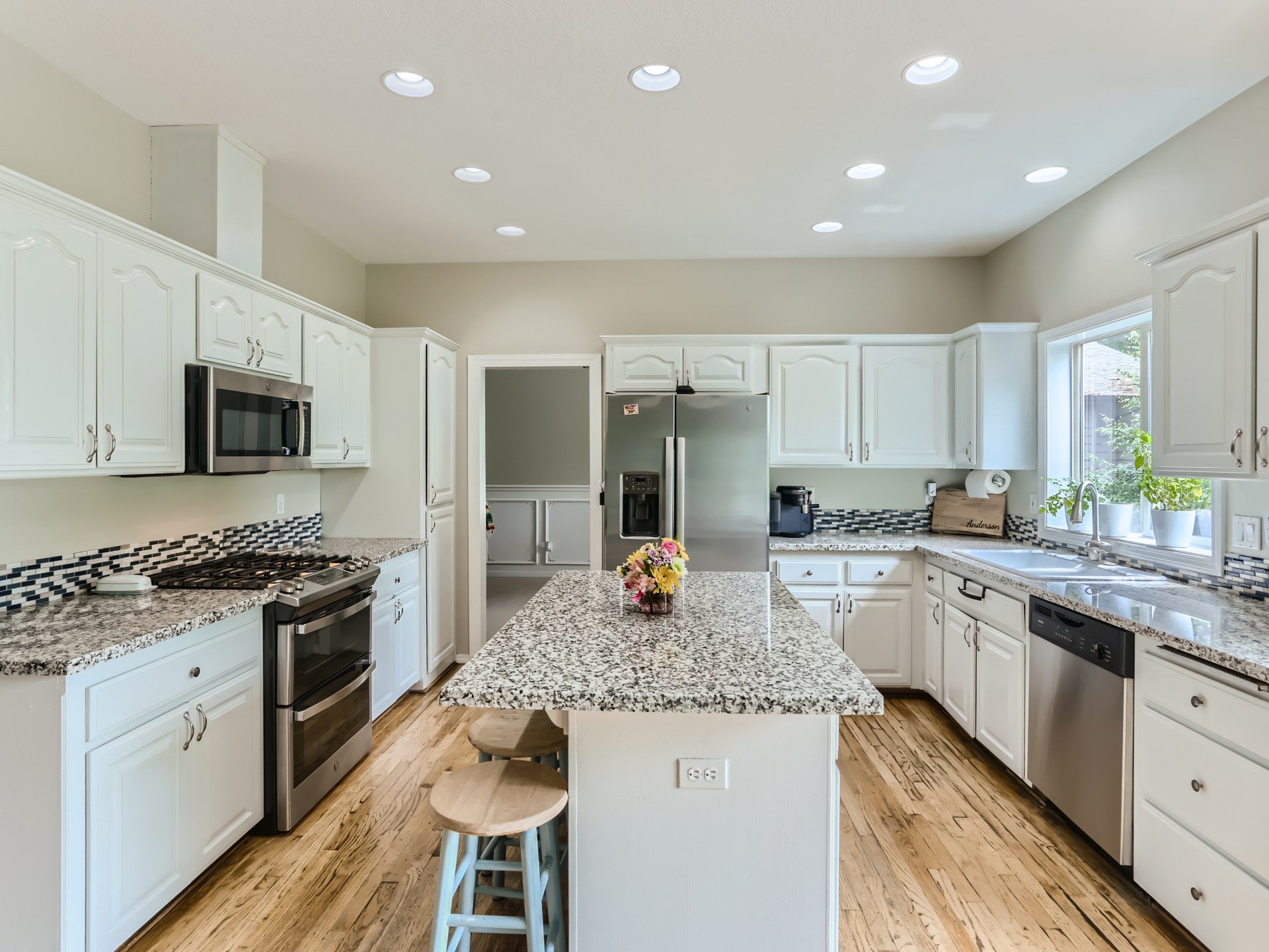Back in the house, you’ll fall in love with the sleek and elegant gourmet kitchen. Quartz countertops, a huge kitchen island, stainless steel appliances, and beautiful tile backsplash will all catch your eye, and the abundant cabinet storage space will delight! And that isn’t all – an adorable butler’s pantry bridges the kitchen to the dining room. An exquisite setup!